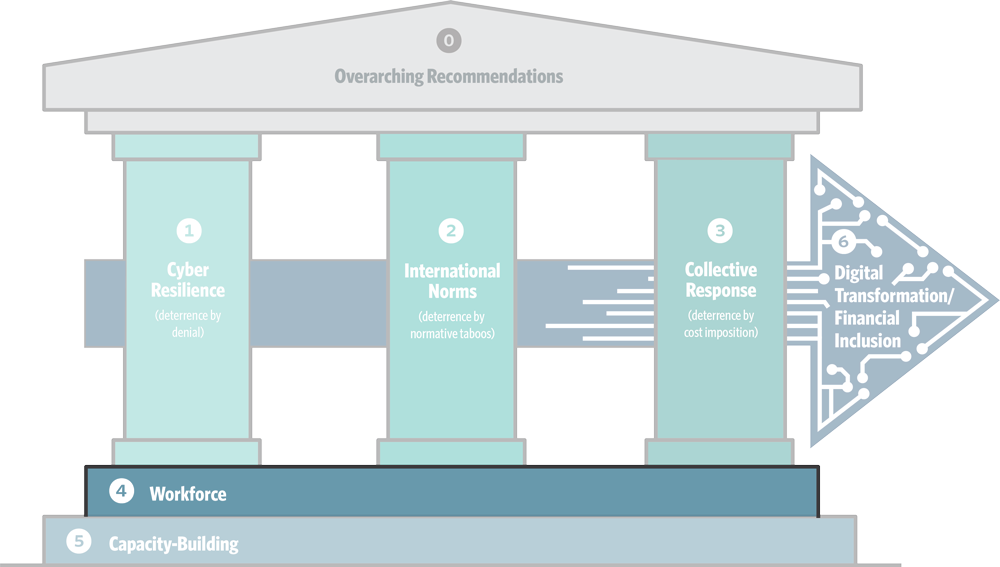 For example, for central bank officials who are already very familiar with ongoing efforts to increase the sector’s resilience, the sections on international norms and collective response will offer new information about how the recommendations focusing on diplomatic initiatives and the national security community can help support their resilience-focused efforts. Similarly, for diplomats focused on advancing international norms, the section on cyber resilience will point to opportunities for implementing these norms. And the challenges with respect to workforce and capacity-building are often neglected but essential to strengthen the system’s weakest links.